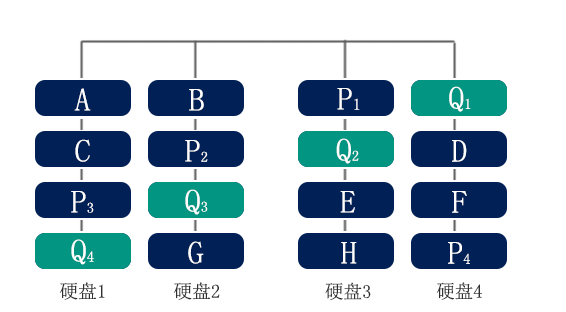 3、如果某個條帶中丟失的兩塊數據是Q和A,那么可以根據校驗P計算出A的數據。